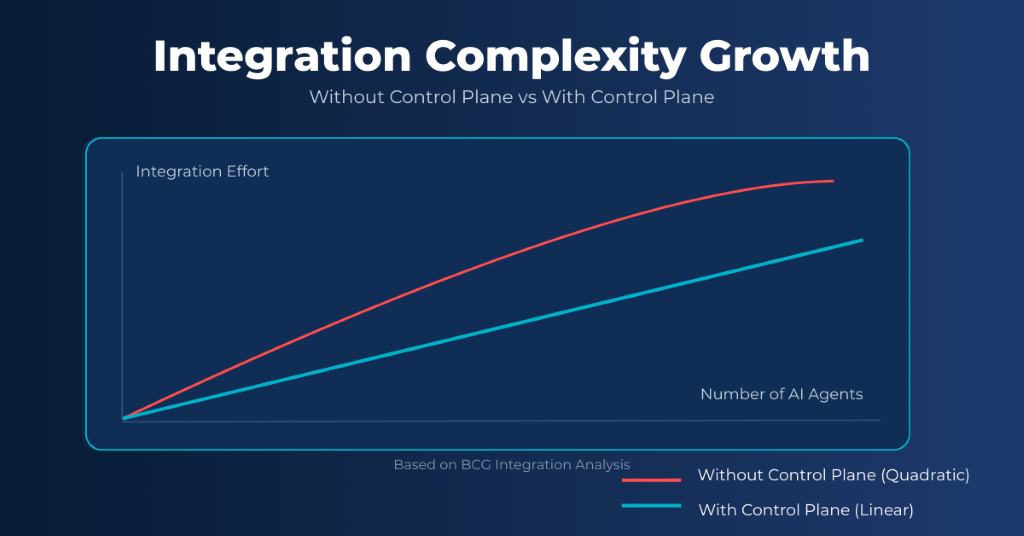 Without a unified approach, integration complexity rises quadratically as AI agents spread. With a control plane, integration effort increases only linearly.
