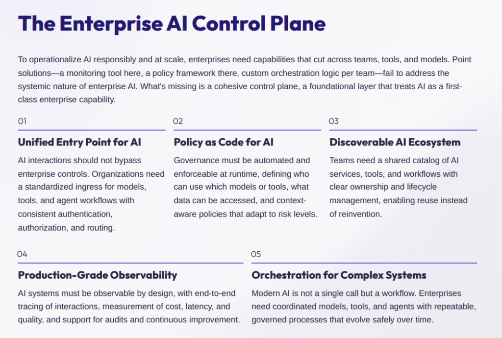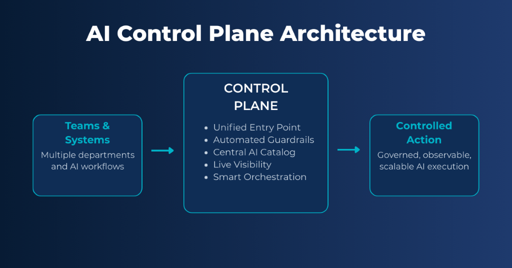 We function as an enterprise AI control plane — a unified layer that sits between AI models and business systems, giving organizations centralized control without slowing innovation.