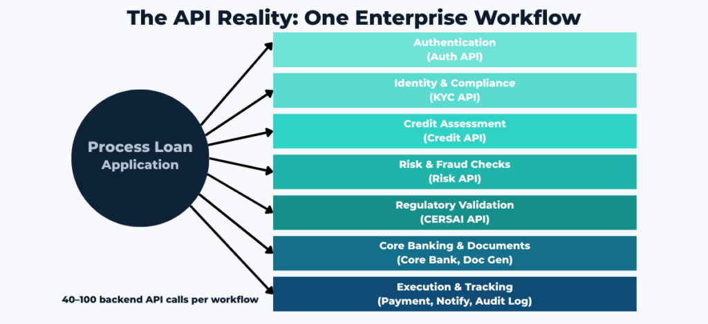A typical enterprise workflow requires 40-100 backend API calls. Each call needs authentication, error handling, retry logic, and monitoring. Each integration was built by a different team at a different time with different conventions.