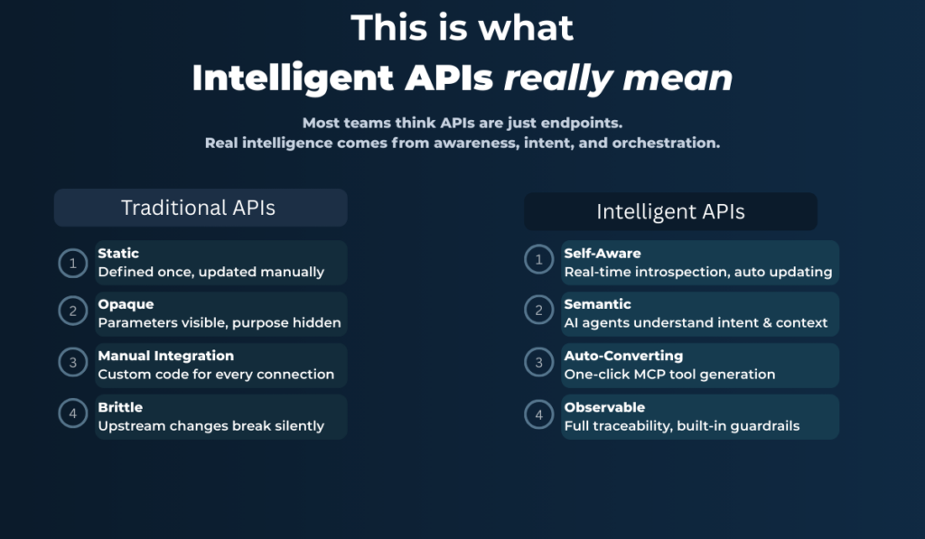 Traditional APIs were built for human developers. Intelligent APIs are built for AI agents.